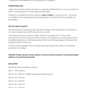 The AQF gas burner is powered by liquid gas from a cylinder, which we can place in the building we will make, or a ready-made SIERRA disruption from our offer.