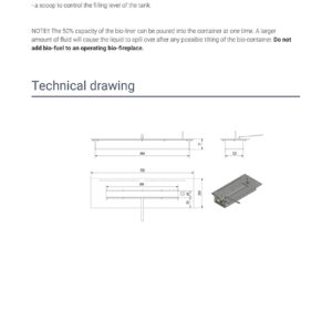 NOTE!! The 50% capacity of the bio-liner can be poured into the container at one time. A larger amount of fluid will cause the liquid to spill over after any possible tilting of the bio-container. Do not add bio-fuel to an operating bio-fireplace.