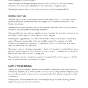 The device has a triple combustion chamber venting system, therefore the wood burning process in the insert is ecological and most importantly economical.