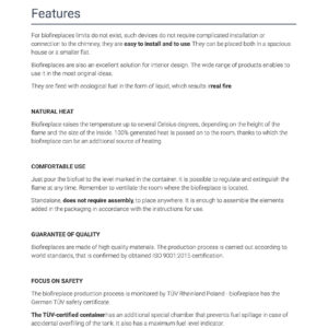 The biofireplace production process is monitored by TÜV Rheinland Poland – biofireplace has the German TÜV safety certificate.