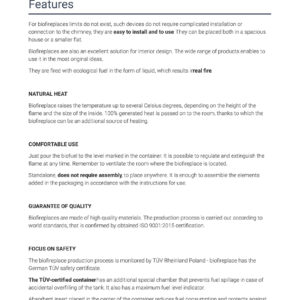 The biofireplace production process is monitored by TÜV Rheinland Poland – biofireplace has the German TÜV safety certificate.