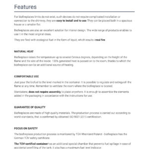 The biofireplace production process is monitored by TÜV Rheinland Poland – biofireplace has the German TÜV safety certificate.