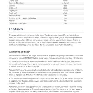 In this insert there is triple air system of combustion chamber. Primary air which enables setting a fire is supplied under the grate. Secondary air – providing economic and ecological burning is supplied by holes on the back wall.