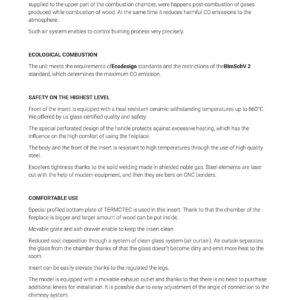 Special profiled bottom plate of TERMOTEC is used in this insert. Thank to that the chamber of the fireplace is bigger and larger amount of wood can be put inside.