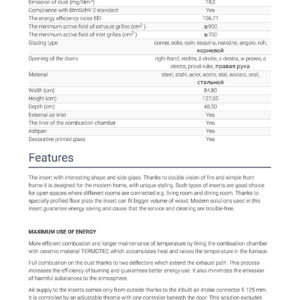 The insert has singular decorative glass thanks to that it looks elegant and modern. Such solution visually enlarges the front of the insert and emphasizes the view of the fire.