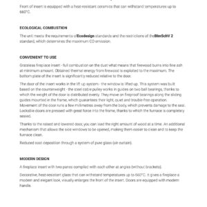 Decorative, heat-resistant glass that can withstand temperatures up to 660°C. It gives a fireplace a modern and elegant look, visually enlarges the front of the insert. Doors are equipped with modern handle.