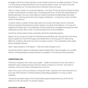 There is a triple air system of combustion chamber in the insert. Primary air, which facilitates the firing of wood, is provided over the entire width of the burning plate insert, on which the whole process of burning takes place. Non-grate insert offers so-called phenomenon of afterburning of the ashes. Secondary air – providing economical and ecological combustion – is supplied by a system of holes located in the back wall.