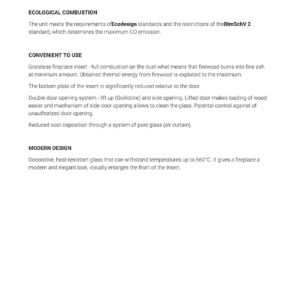 Efficient burning process and maintaining of temperature to keep the warmth for longer thanks to lining of combustion chamber with TERMOTEC – heat accumulating material which raises the temperature in the combustion chamber.