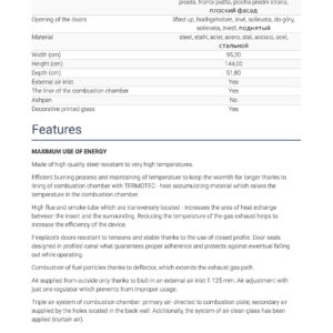 Efficient burning process and maintaining of temperature to keep the warmth for longer thanks to lining of combustion chamber with TERMOTEC – heat accumulating material which raises the temperature in the combustion chamber.