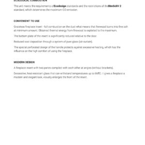 High flue and smoke tube which are transversely located – increases the area of heat echange between the insert and the surrounding. Reducing the temperature of the gas exhaust helps to increase the efficiency of the device.