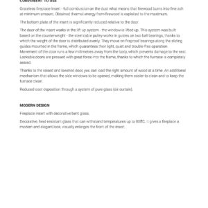 The door of the insert works in the lift up system – the window is lifted up. This system was built based on the counterweight – the steel cable pulley works in guides on two ball bearings, thanks to which the weight of the door is distributed evenly. They move on fireproof bearings along the sliding guides mounted in the frame, which guarantees their light, quiet and trouble-free operation. Movement of the door runs a few millimetres away from the body, which prevents damage to the seal. Lockable doors are pressed with great force into the frame, thanks to which the furnace is completely sealed.