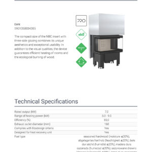 The compact size of the NBC insert with three-side glazing combines its unique aesthetics and exceptional usability. In addition to the visual qualities, the device guarantees efficient heating of rooms and the ecological burning of wood. Thanks to the use of modern materials and innovative technical solutions, it is characterized by very good technical parameters. One of its many advantages is the possibility of connecting the air intake from the outside. The glass glazing of the insert provides its elegance. What is more, it has a parental lock that protects you from unauthorized door opening.