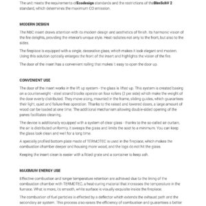 The NBC insert draws attention with its modern design and aesthetics of finish. Its harmonic vision of the fire delights, providing the interior’s unique style. Heat radiates not only to the front, but also to the sides.