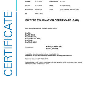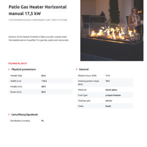 PATIO does not emit any sound or smell. Its action also does not affect air circulation, which is particularly important for users who are allergic. The device can operate at full power, continuously up to 10 hours. The device is designed for 11 kg cylinders. The device is adapted to both propane-butane gas and pure propane. We recommend using cylinders with pure propane. PATIO does not require cleaning of the glass panes, as fire does not smoke them. Its start-up is very easy and intuitive to use.