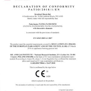 The upper construction of the heater ensures protection against the burning fire. Additionally, it evenly distributes the heat generated in it in four directions.PATIO is equipped with a special anti-tilt valve which in case of the device overturning automatically cuts off the gas supply to the controller, which extinguishes the flame. The device is not dependent from electrical system, that is why we are sure that even in the absence of electricity, it will illuminate the terrace or garden. The heater is equipped with a fully secured and advanced manual gas control system which prevents from uncontrolled fuel leak.