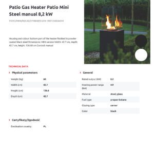 The Patio Mini has been equipped with a special anti-tank valve which automatically cuts the gas supply to the regulator in the event of a drop in the device, extinguishing the flame. The device does not depend on an electrical installation, so you can be sure that it will illuminate the terrace or the garden even in the event of a power failure.