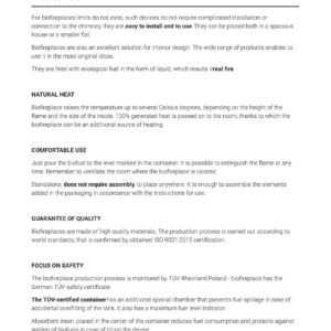 The biofireplace production process is monitored by TÜV Rheinland Poland – biofireplace has the German TÜV safety certificate.