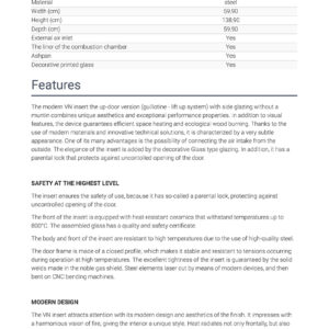 The modern VN insert the up-door version (guillotine – lift up system) with side glazing without a muntin combines unique aesthetics and exceptional performance properties. In addition to visual features, the device guarantees efficient space heating and ecological wood burning. Thanks to the use of modern materials and innovative technical solutions, it is characterized by a very subtle appearance. One of its many advantages is the possibility of connecting the air intake from the outside. The elegance of the insert is added by the decorative Glass type glazing. In addition, it has a parental lock that protects against uncontolled opening of the door.