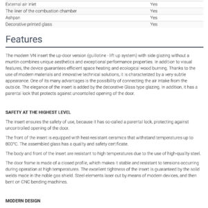 The modern VN insert the up-door version (guillotine – lift up system) with side glazing without a muntin combines unique aesthetics and exceptional performance properties. In addition to visual features, the device guarantees efficient space heating and ecological wood burning. Thanks to the use of modern materials and innovative technical solutions, it is characterized by a very subtle appearance. One of its many advantages is the possibility of connecting the air intake from the outside. The elegance of the insert is added by the decorative Glass type glazing. In addition, it has a parental lock that protects against uncontolled opening of the door.
