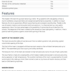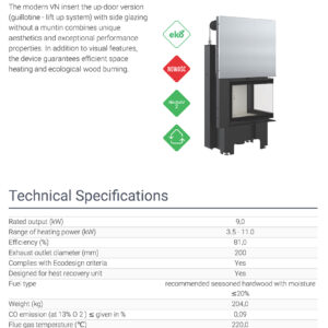 The modern VN insert the up-door version (guillotine – lift up system) with side glazing without a muntin combines unique aesthetics and exceptional performance properties. In addition to visual features, the device guarantees efficient space heating and ecological wood burning. Thanks to the use of modern materials and innovative technical solutions, it is characterized by a very subtle appearance. One of its many advantages is the possibility of connecting the air intake from the outside. The elegance of the insert is added by the decorative Glass type glazing. In addition, it has a parental lock that protects against uncontolled opening of the door.
