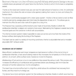 The insert has a horizontal flue, built in a high flue, which allows for additional heat recovery from fumes, and thus maximum energy use.