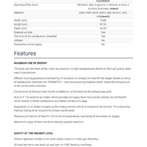Efficient burning process & maintaining of temperature to keep the warmth for longer thanks to lining of combustion chamber with TERMOTEC – heat accumulating material which raises the temperature in the combustion chamber.