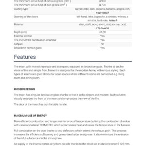 The insert has singular decorative glass thanks to that it looks elegant and modern. Such solution visually enlarges the front of the insert and emphasizes the view of the fire.