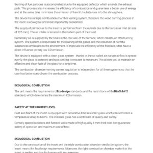 The device has a triple combustion chamber venting system, therefore the wood burning process in the insert is ecological and most importantly economical.