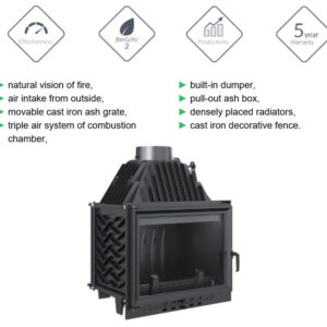 Keeping the insert clean is easier with a fitted grate and a container where the ash is collected. In addition, the insert has a removable fence, which prevents the wood from falling out of the hearth and makes cleaning of the fireplace easier.