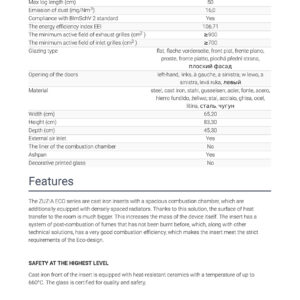 The ZUZIA ECO series are cast iron inserts with a spacious combustion chamber, which are additionally equipped with densely spaced radiators. Thanks to this solution, the surface of heat transfer to the room is much bigger. This increases the mass of the device itself. The insert has a system of post-combustion of fumes that has not been burnt before, which, along with other technical solutions, has a very good combustion efficiency, which makes the insert meet the strict requirements of the Eco-design.